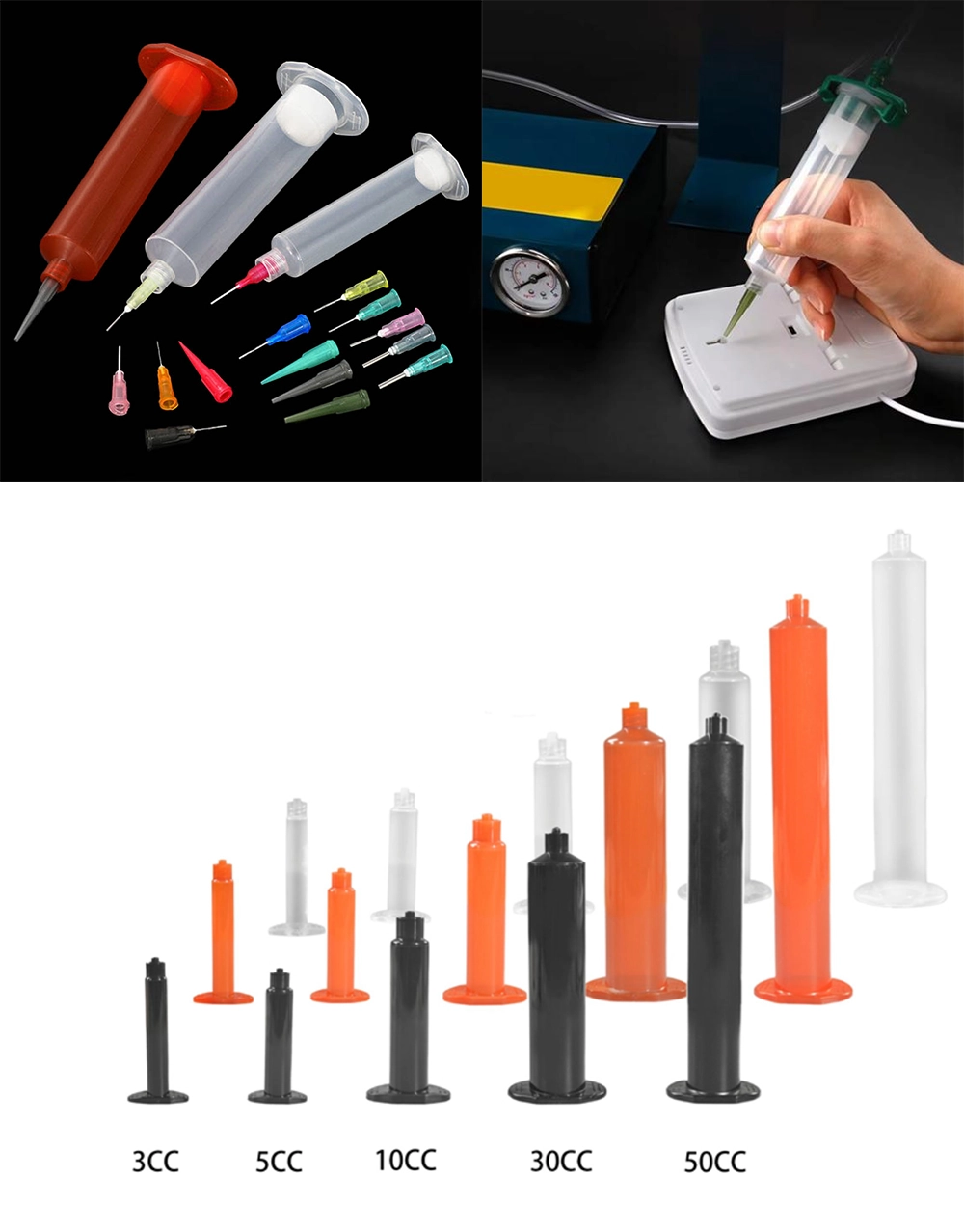 Den gennemsigtige sprøjte er egnet til alle former for lim til elektronisk emballage, ledende lim, flux, rød SMT-lim til patches, smøreolie, maling osv. Sort er egnet til UV-lim, lyshærdende lim og til lejligheder, hvor sort nuance er påkrævet. Ravfarvet er egnet til generelle UV-beskyttelsesopgaver, langtidsopbevaring af UV-lim anbefales ikke. Materiale: PP